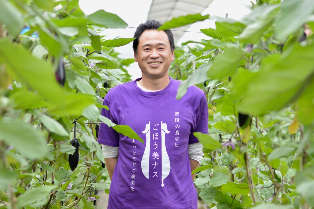 その中で生まれたものの一つが「ごほう美ナス」。ナスを買うとき、ほとんどの方はなるべく安いものを買いたいと思っているでしょう。そのような消費材としてのナスではなく、自分のため、大切な人のためにちょっとしたご褒美になるような、ここでしか買えない嗜好材としての美味しいナスを作ろうと考え、形にしました。ごほう美ナスは、一般社団法人日本野菜ソムリエ協会が主催する野菜ソムリエサミットで金賞も受賞しています。