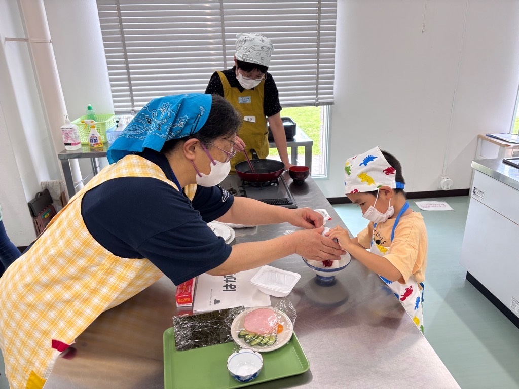 おんぶコースは「クロックムッシュ」さくらコースは「スティックおにぎり」を作りました。おみやげには、青空寒天をもらいました。