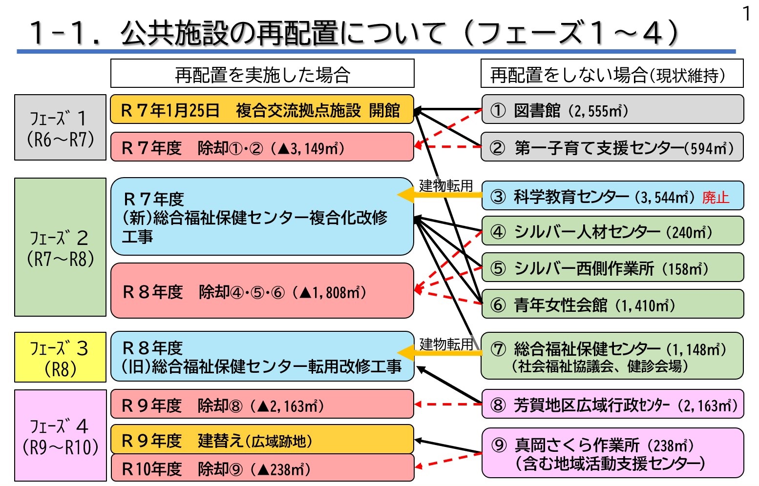市民へのサービスや建物の老朽化など課題を抱えている施設の再配置を行い、将来にわたる財政負担の軽減を図り、よりよい公共サービスを提供することを目的として、図のとおりフェーズ1からフェーズ4の段階で再配置を進めています。本事業により、再配置をしない場合と比較し、約9億1千万円の削減効果が見込まれます。