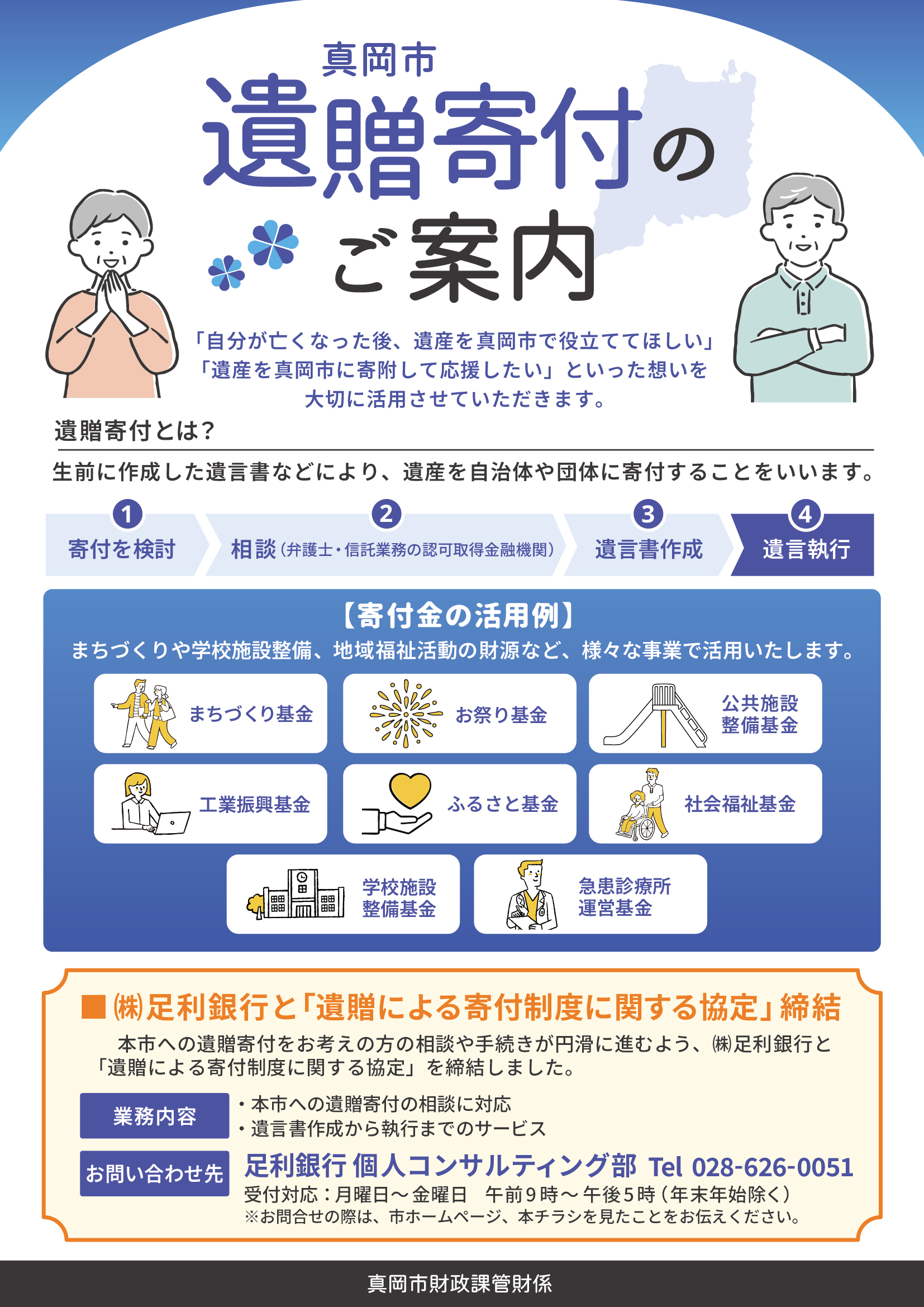 市へ遺贈を希望する方から相談や申し出があった場合は、株式会社足利銀行の相談窓口を紹介します。