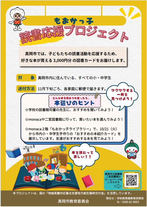 真岡市では、子どもたちの読書活動を応援するため、国の「物価高騰対応重点支援地方創生臨時交付金」を活用し、3,000円の図書カードをお届けします。