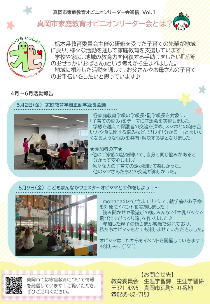 真岡家庭教育オピニオンリーダー会通信 Vol.1(令和7年4月~6月活動報告) (JPEG: 218.7KB)