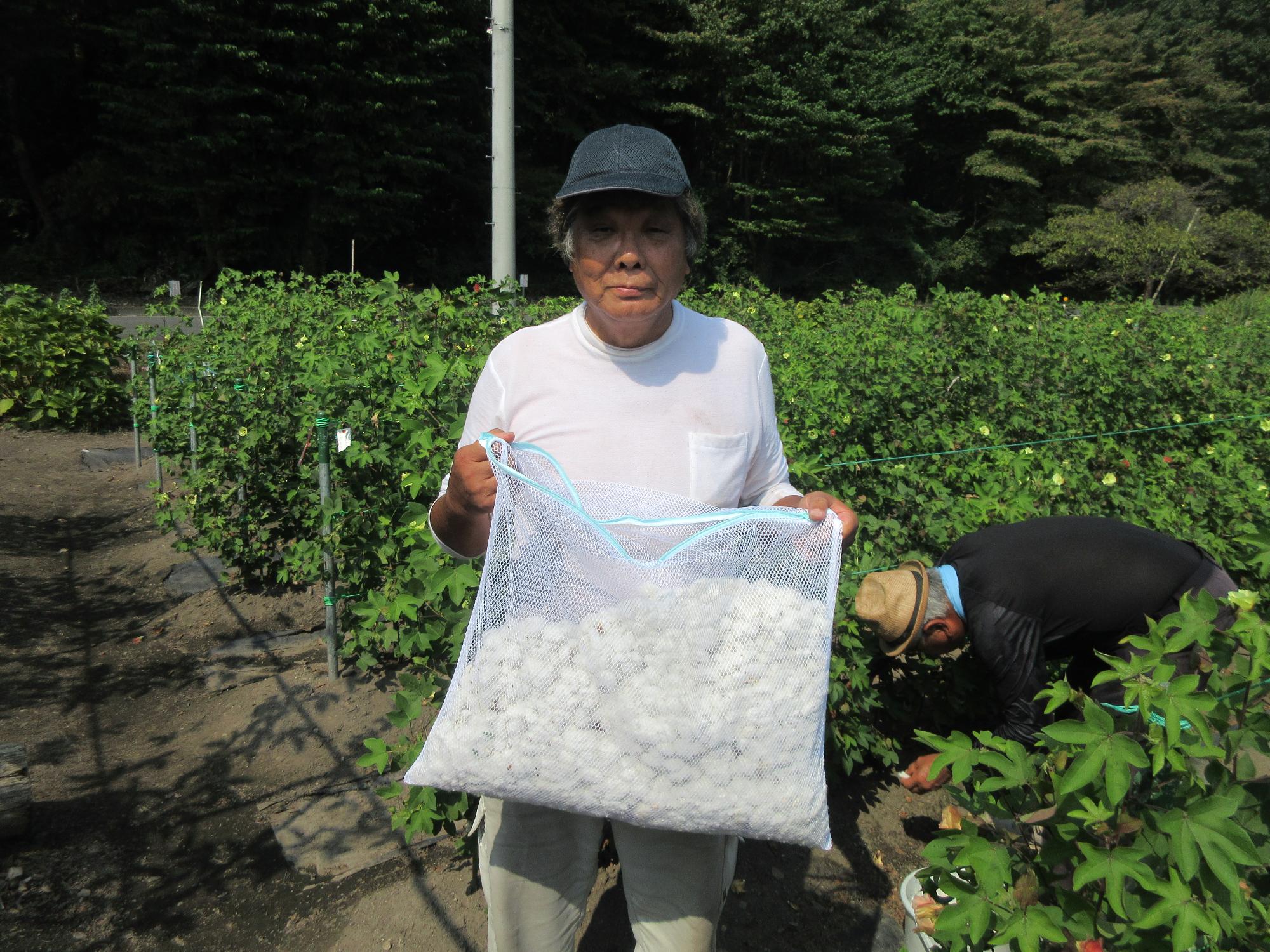 神鋼真岡旧友会の皆さんが作業されている場所では、真岡の花である綿の栽培もされており、今年は約70kgの収穫がありました。