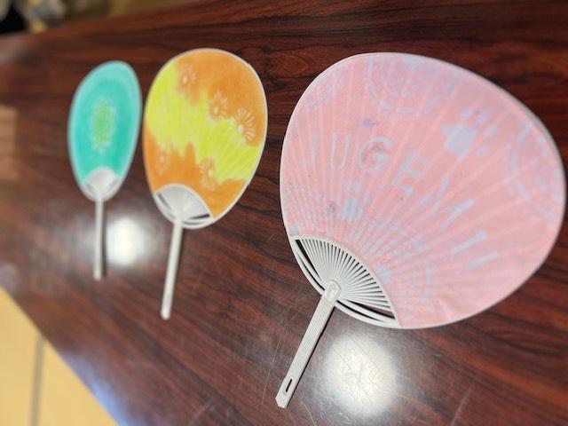 カラフルなインクで手形が押されたうちわの写真